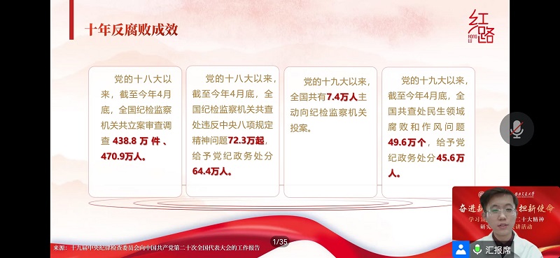 “红路”研究生理论学讲团成员、土木工程学院2022级硕士生于佳琪以《永葆青春,永远在路上》为题进行分享。他以我国近十年来的反腐斗争及取得的成效为依据,详细讲述了中国共产党全面从严治党、勇于自我革命的深刻内涵和本质要求。