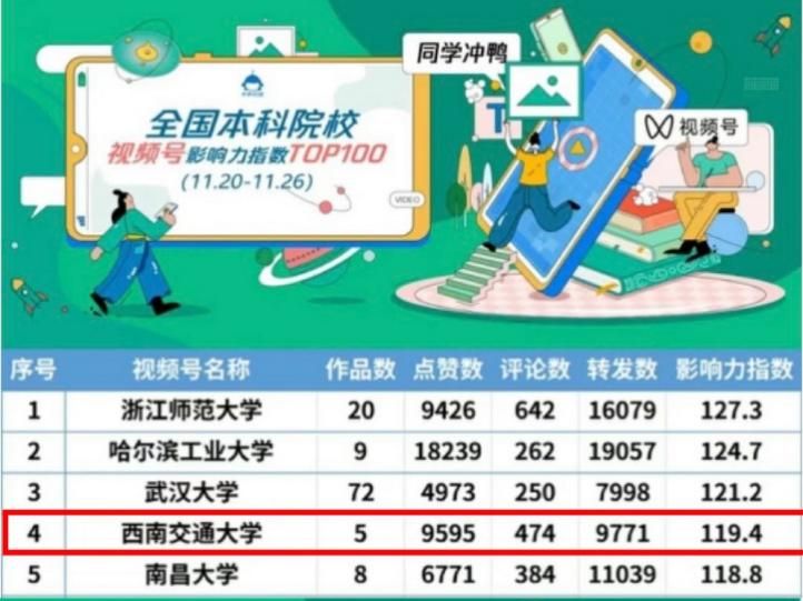 官方微信视频号影响力指数位居全国本科院校周榜(2023.11.20-2023.11.26)第四名。