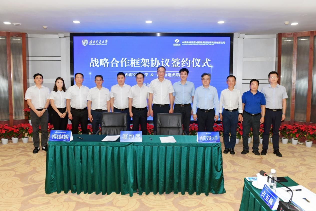 与中国电建集团成都勘测设计研究院有限公司在九里校区签订战略合作框架协议。中国电建成都院党委书记、董事长何彦锋,总经理张世殊,学校党委书记余敏明、校长闫学东出席签约仪式。签约仪式由中国工程院院士、学校党委常委、副校长何川主持。