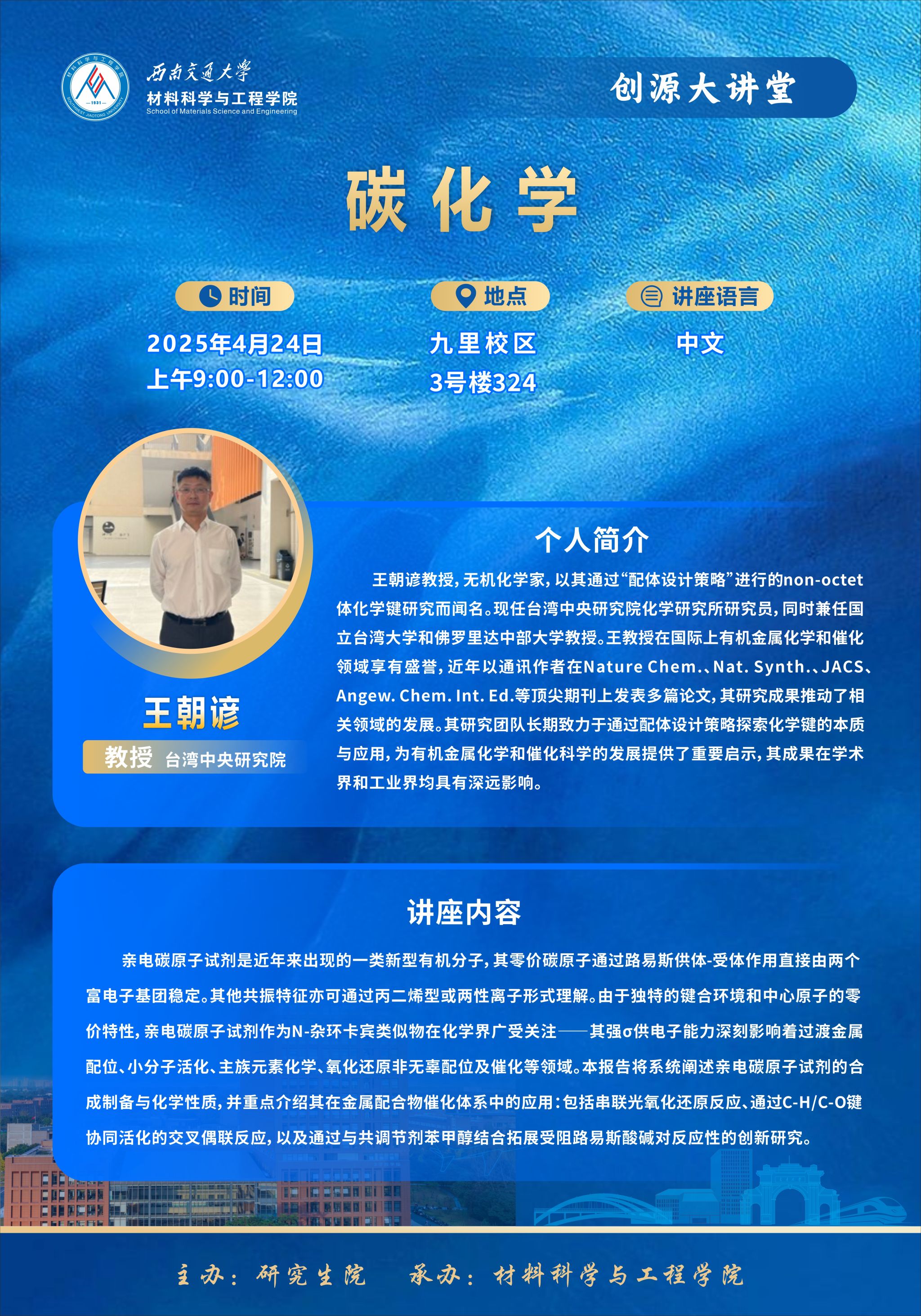 王朝谚教授,无机化学家,以其通过“配体设计策略”进行的non-octet体化学键研究而闻名。现任台湾中央研究院化学研究所研究员,同时兼任台湾大学和佛罗里达中部大学教授。王教授在国际上有机金属化学和催化领域享有盛誉,近年以通讯作者在Nature Chem.、Nat. Synth.、JACS、Angew. Chem. Int. Ed.等顶尖期刊上发表多篇论文,其研究成果推动了相关领域的发展。其研究团队长期致力于通过配体设计策略探索化学键的本质与应用,为有机金属化学和催化科学的发展提供了重要启示,其成果在学术界和工业界均具有深远影响。
