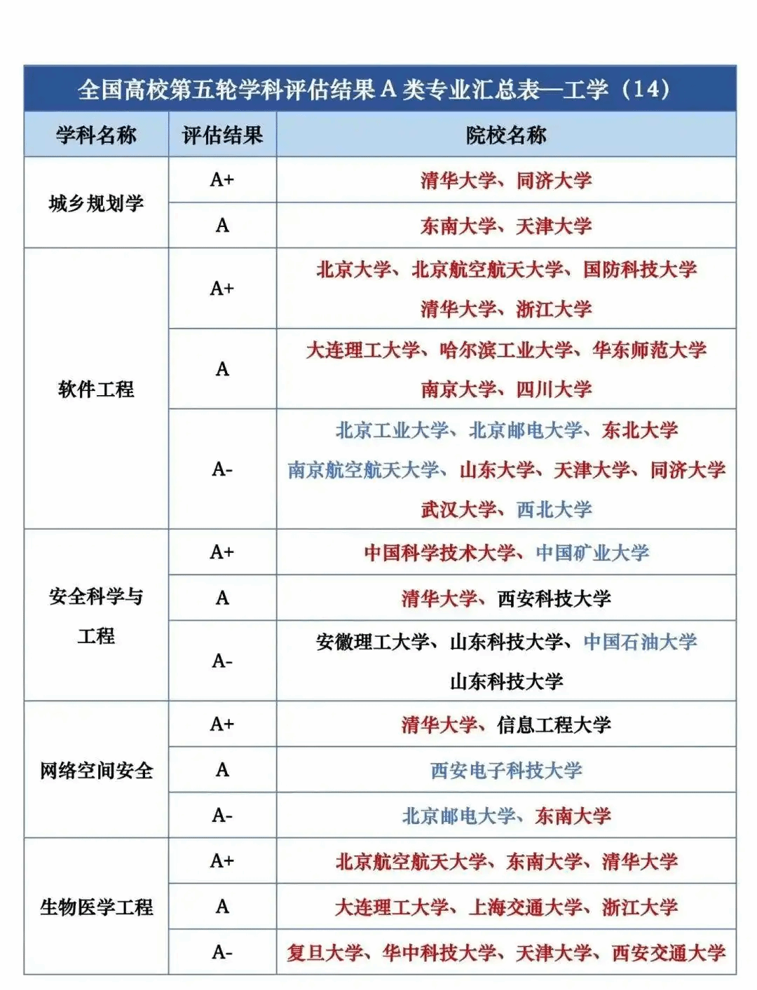全国高校第五轮学科评估结果A类专业汇总
