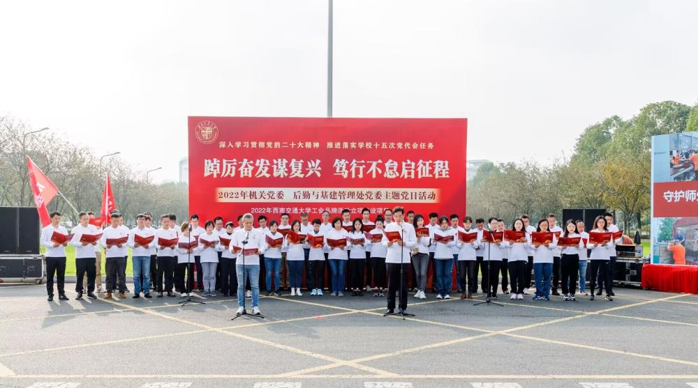 11月10日下午,为深入学习贯彻党的二十大精神,进一步推动落实学校第十五次党代会任务。由机关党委和后勤与基建管理处党委联合举办的“踔厉奋发谋复兴 笃行不怠启征程——经典诵读+红色微马”主题党日活动在犀浦校区顺利开展,该活动为2022年学校工会品牌活动立项建设项目。校党委副书记、纪委书记张学龙,党委常委、副校长康国政,党委常委、副校长刘长军和党委常委、宣传部部长卢世炬出席此次活动,校机关,后勤与基建管理处及各服务中心党员、职工500余人齐聚在升旗台广场,重温初心使命。机关党委书记贺平主持活动。
