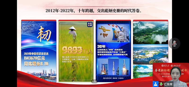 “红路”研究生理论学讲团成员、外国语学院2020级硕士生韩沁儒以《深刻领悟“两个确立”的决定性意义——新征程领路人习近平》为题讲述了习近平总书记亲自谋划、亲自领导、亲自指挥,造就了非凡十年的伟大变革。新征程上,“两个确立”正指引着具有悠长文明的民族和国家进行着人类历史上气势如虹、激动人心的伟大实践。
