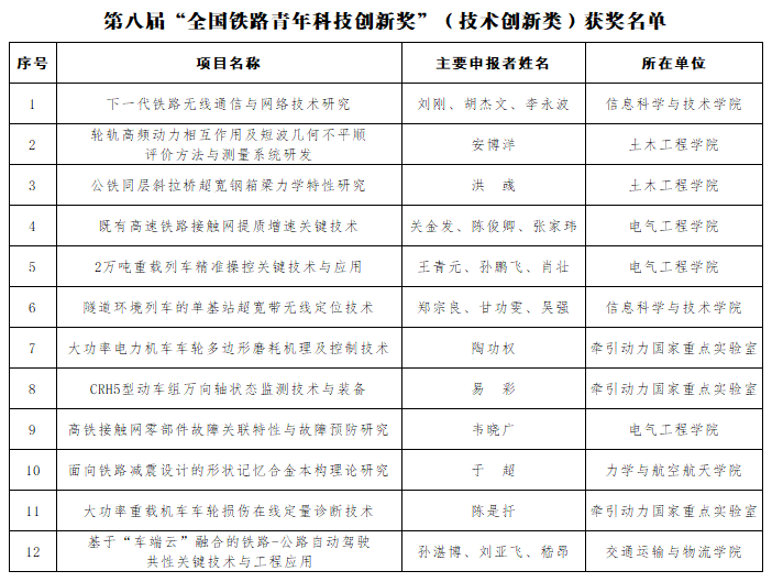 共有13个项目荣获该奖项。土木工程学院安博洋、洪彧,电气工程学院关金发、陈俊卿、张家玮、王青元、孙鹏飞、肖壮、韦晓广,信息科学与技术学院刘刚、胡杰文、李永波、郑宗良、甘功雯、吴强,交通运输与物流学院孙湛博、刘亚飞、嵇昂,力学与航空航天学院于超,牵引动力国家重点实验室陶功权、易彩、陈是扦的12个项目荣获第八届“全国铁路青年科技创新奖”(技术创新类)。另悉,搜书吧